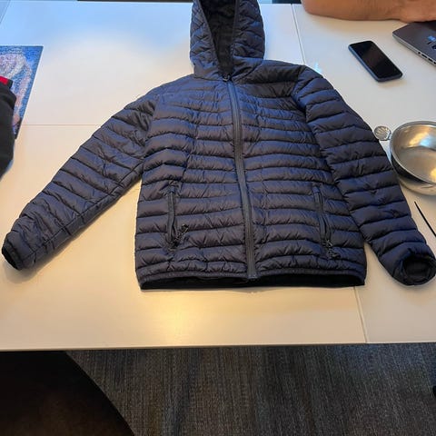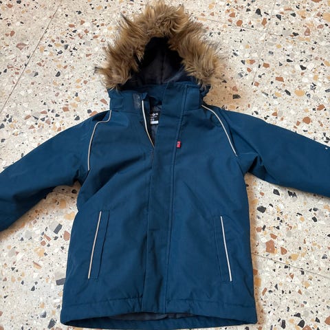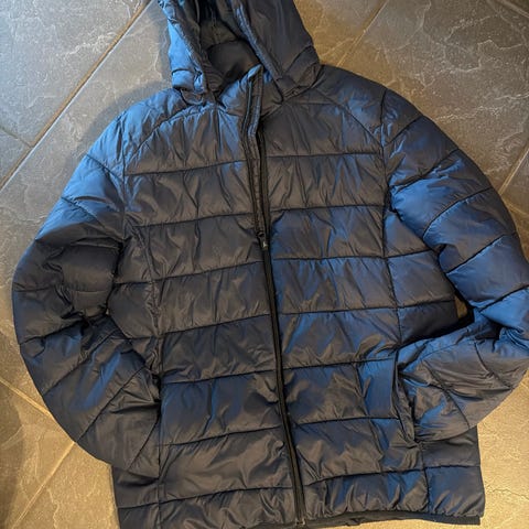 Vikafjell jakke for barn i størrelse 122. Jakken er blå og laget i polyester. Den har hette, gjennomgående glidelås foran og to glidelåslommer i siden. Lett vattert med horisontale sømmer som holder fyllet på plass.