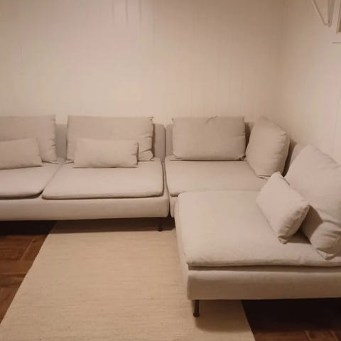 Veldig fint brukt ingen flekker. Nyvasket trekk. Alle trekkene kan vaskes i vaskemaskin. Nye trekk og deler til sofaen kan kjøpes på Ikea.