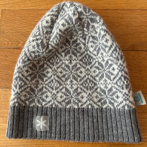 Lue i myk merinoull med lappen på. Selges da vi har for mange luer.