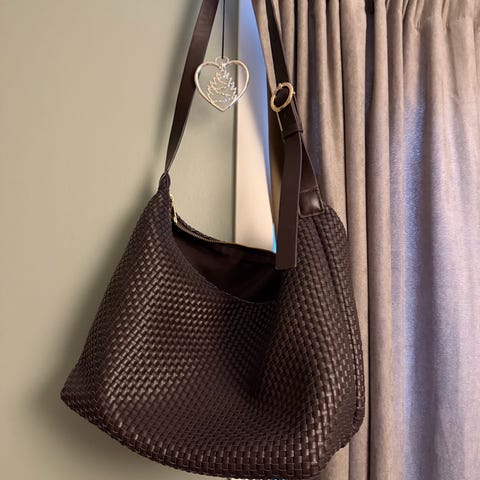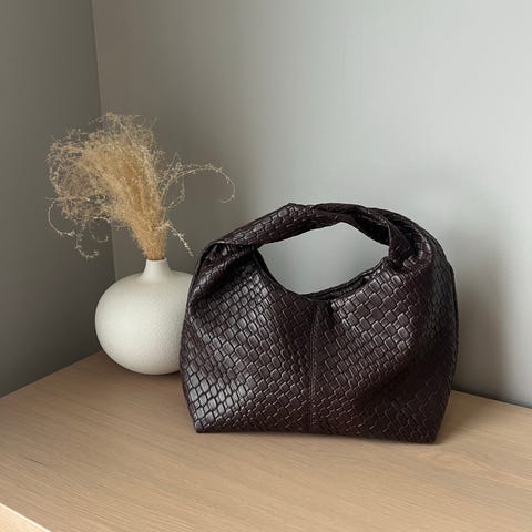 Veske i grå kunstlær til dame. Vesken har flettet struktur på utsiden og et kort skulderhåndtak i samme materiale. Innvendig har den hovedrom med glidelåslukking, en liten glidelåslomme og åpne lommer for mindre eiendeler. Egnet til daglig bruk for oppbevaring av personlige ting som lommebok, mobil og nøkler.