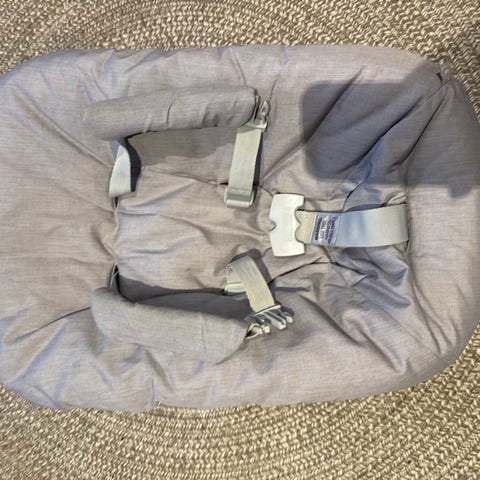 Stokke barnestol babyinnlegg i grå tekstil. Innlegget har integrert sele og polstret liggeflate for spedbarn. Undersiden har ventilert plastskall og festeanordninger tilpasset Stokke barnestol. Egnet som ekstra eller utskiftbart babyinnlegg til kompatibel Stokke barnestol.