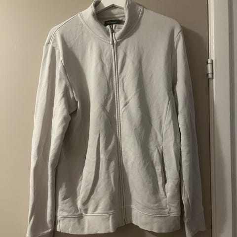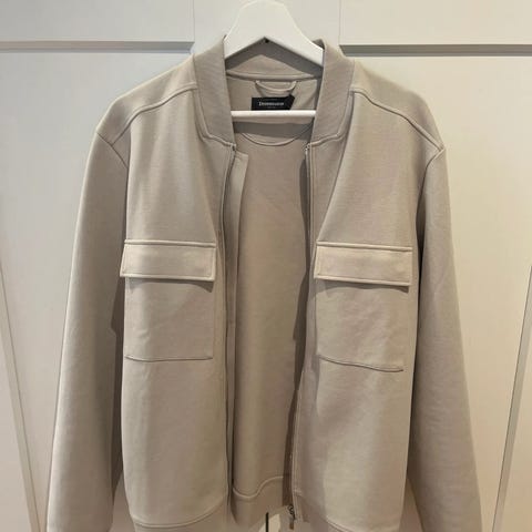 Dressmann jakke for herre i størrelse M. Jakken er grå og har høy krage, glidelås i front og flere lommer, blant annet to brystlommer med klaff. Ermene har mansjetter med knappelukking. Passer som lett ytterjakke eller mellomlag i hverdagen.