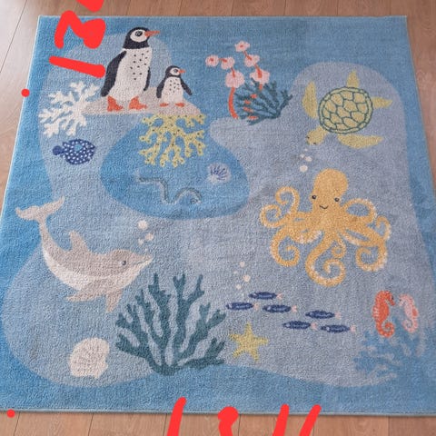 Pent brukt teppe til barnerom. Veldig mykt. Sklir lett på gulvet, så bør ha antiskli under. Har akkurat renset det, men solflekker kan forekomme. Vært i hus med katt og hund.