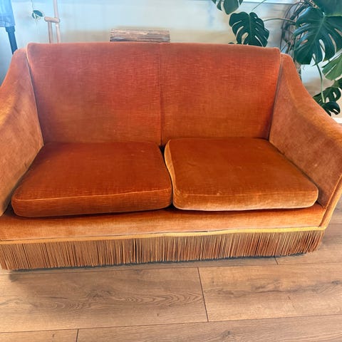 Gir bort en typisk norsk hyttesofa gruppe. Stått da på en hytte i mange år. Fremstår som fin. Gruppa består av en 3-seter, lenestol med pall og en vanlig stol. Usikker på produsent eller hvor den er kjøpt i sin tid.