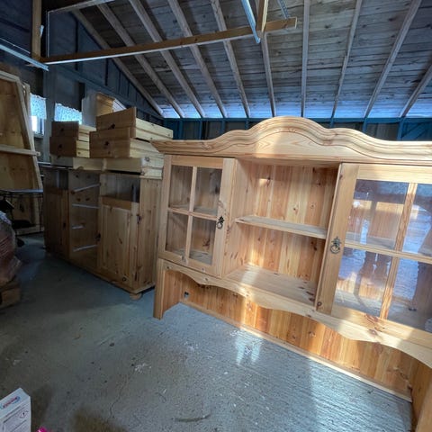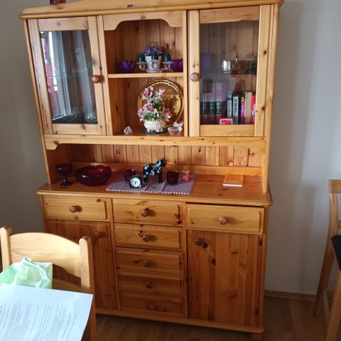 Ca 55 år gammel veggseksjon selges. Heltre furu. Utskåret, fint håndverk. Flere låsbare rom som sees på bildet. Må vel passe fint på en hytte o.l. Bud ønskes. Tlf 95797494