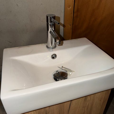Baderomsinnredning med servant og skap lys tre