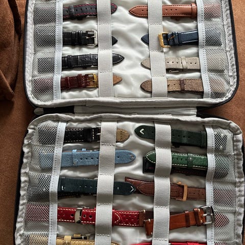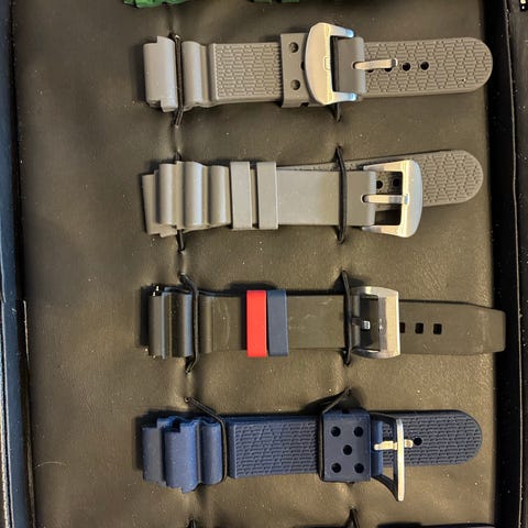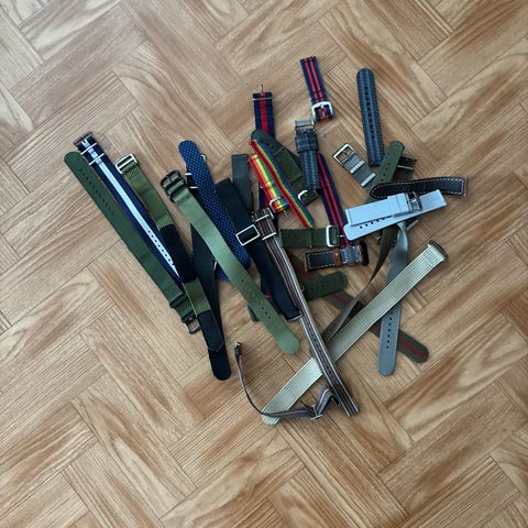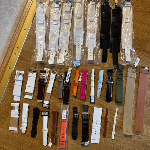60 klokkereimer selges samlet. Exceltabell med detaljer- bredder, pris etc., vurdert og godkjent av urmaker, følger vedlagt: 38 NATOreimer- 30 nye og 8 pent brukte, 9 nye Silikon-/gummireimer inkl 2 SEIKO, 11 Lærreimer- 7 nye og 4 pent brukte, 2 Metallreimer nye.