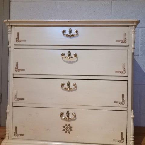 Eldre, stor og romslig, kommode. Den har behov for et strøk maling da den ble røfft behandlet under flytting. En av skuffeknottene, ikke originale, har litt dårlig feste. Selve skuffedelen kan løftes av sokkelen. Den er tung om dere må være to for å hente den. Står i kjelleretasje uten heis.