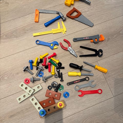 Godt brukt leke verktøykasse med div verktøy