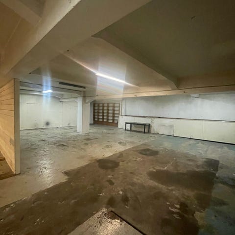 Innendørs lagerlokale med betonggulv og malte vegger. Lokalet har flere vinduer som gir naturlig lys, samt elektriske installasjoner i taket. Egner seg som lager- eller arbeidsrom der det er behov for et enkelt, åpent areal med fast dekke.