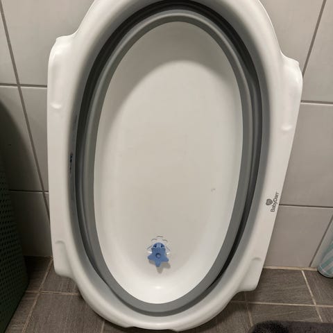 Baby Ok stellebord for badekar i beige plast. Stellebordet er utformet for å plasseres over badekar og gir en forhøyet stelleflate, samt at det er plassbesparende. Det har sammenleggbare ben med breddejustering og en tynn polstret madrass. Det vannavstøtende trekket har sprukket opp i et hjørne, se bilde.