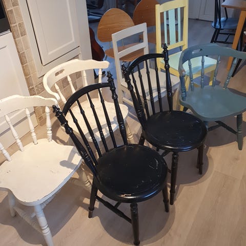 Solide sortmalte spisestuestoler med trehvite seter til salgs
