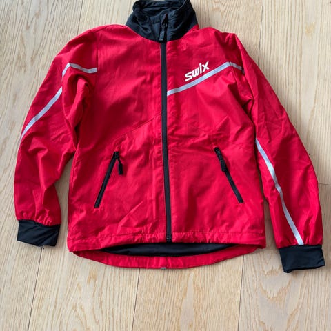 Pent brukt rød Swix langrennsjakke, ca str.12 år til salgs. Tolags, med fleecefôr inni, to lommer og snøring nederst.