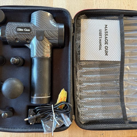 Settet inkluderer massasjepistol, flere massasjehoder og lader, organisert i et polstret etui for oppbevaring og transport.