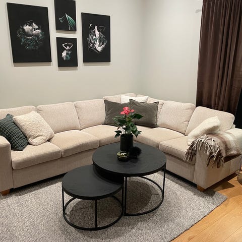 Selger en hjørnesofa med tilhørende puff i lys grå farge, fra Bohus.