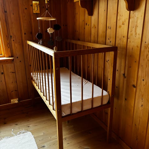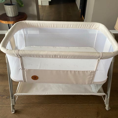 Lionelo Luna sprinkelseng i beige tekstil med metallramme. Sengen har nettingpaneler på sidene for bedre luftgjennomstrømming og innsyn til barnet. Høyden kan justeres i flere trinn, og liggedelen kan vinkles etter behov. Under sengen er det en praktisk oppbevaringshylle for utstyr. Mål ca.: lengde 96 cm, bredde 60 cm, høyde 72–87 cm, liggehøyde 38–53 cm. Egnet som babyseng/sidebed ved siden av voksenseng i spedbarnsperioden.