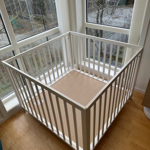 Lekegrind med hjul i god stand noen bruksmerker her og der hvor maling er litt skrapt bort. Madrassen er ekstra høy og laget av vanlig madrass som kan følge med.