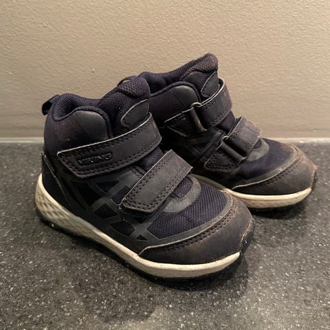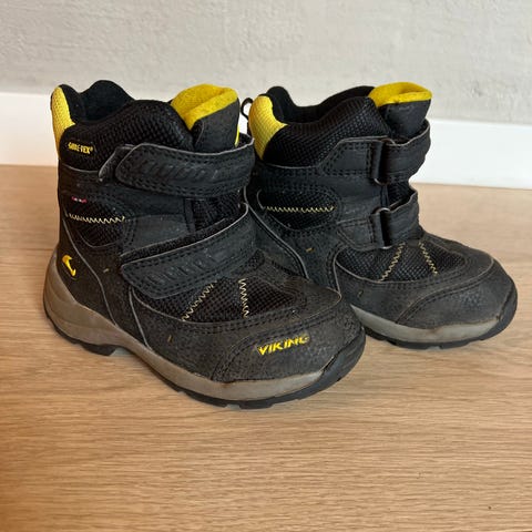 Pent brukte Viking overgangssko med Gore-Tex åi størrelse 25. Skoene er svarte med lyse kontrastsømmer og hvit mellomsåle. Borrelås.