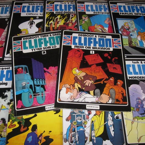 Clifton tegneseriealbum samling på norsk. Serien er laget av Turk & De Groot og utgis i albumformat med myke permer. Tegneseriene er humoristiske krim- og agenthistorier med Clifton som hovedfigur. Egner seg for lesere som liker klassiske europeiske tegneserier og samlealbum på norsk.