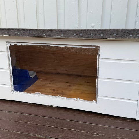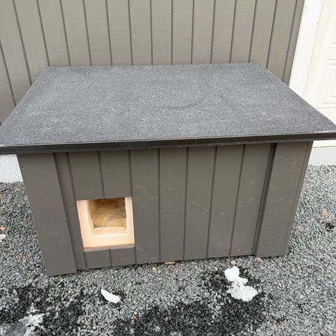 Katte hus i tre. Rektangulær kasse med flatt tak og rund inngang i front. Egnet som ly og hvileplass for katt eller annet mindre husdyr.