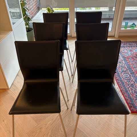 Elegante skinn spisebordstoler med stålben. Sykt gode .