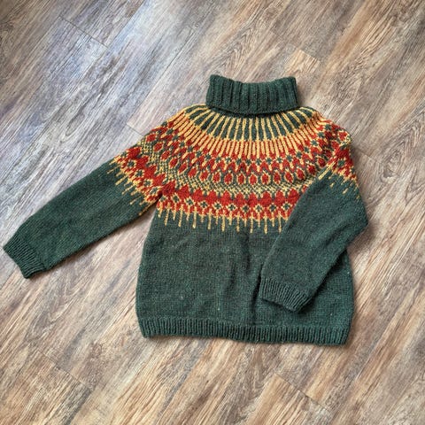 Hjemmestrikket ullgenser selges. Oppskrift er høstbladgenser fra Friluftsstrikk av Stine Viberg.
