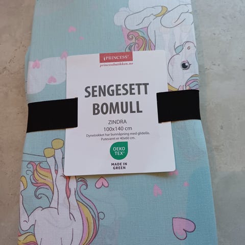 Helt nytt sengesett i krepp til barn selges. Mål: 80x100 cm. Nypris 299 kr