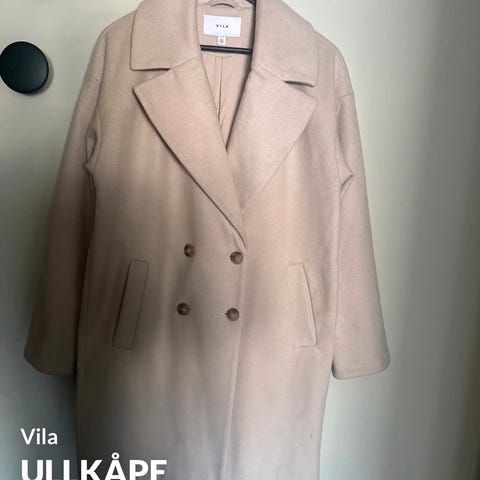 Vila kåpe for dame i størrelse M. Kåpen er grå med rutemønster og har belte i livet. Materialet inneholder 50 % ull, som gir et varmt og mykt plagg egnet som yttertøy i kjøligere vær. Kåpen har lange ermer og knepping foran, og passer som hverdagskåpe eller til mer formelle anledninger.