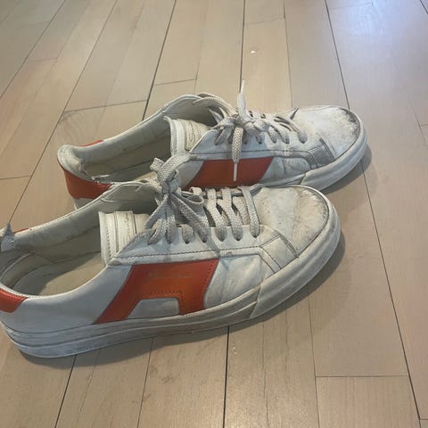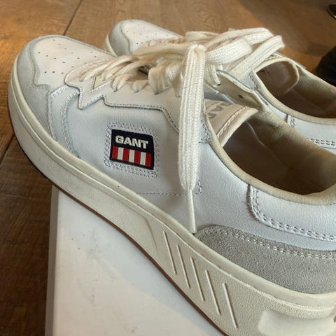 Gant sneakers/joggesko i størrelse 37. Modellen har overdel i hovedsakelig hvit og beige med rødt felt på hælen og lys såle. Skoene har noen merker på såle, ikke prøvd å vaske bort. Ellers ingen merker, og veldig pent brukt.