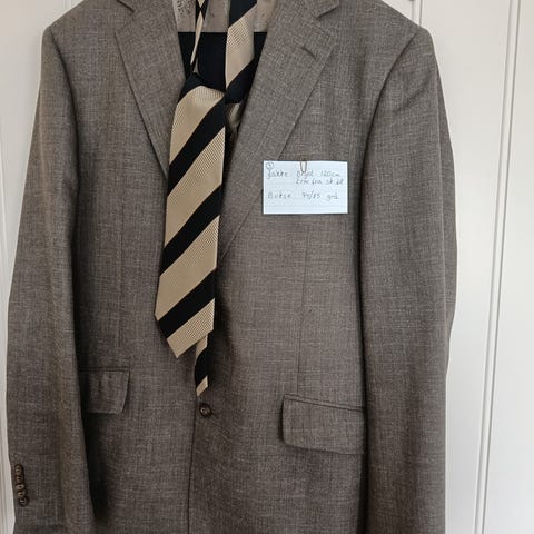 Fin dress i en brunfarge på jakken med sort bukse til buksen har str 94/85 og slips
