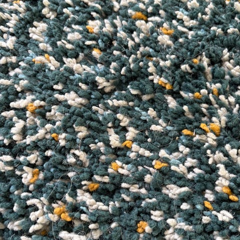 IKEA teppe i flerfarget mønster med løkke- og flosstruktur. Teppeoverflaten består av tett tuftede garnløkker i hovedsakelig mørkegrønn, hvit og gule toner. Egnet som gulvteppe i stue, soverom eller gang.