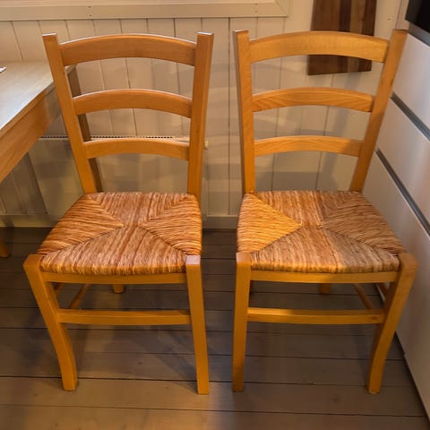 2 stk spisestoler selges. Noen bruksmerker er der, se bilder. Bruksmerkene har ingenting å si for bruk/funksjonalitet og kan sannsynligvis vaskes bort.