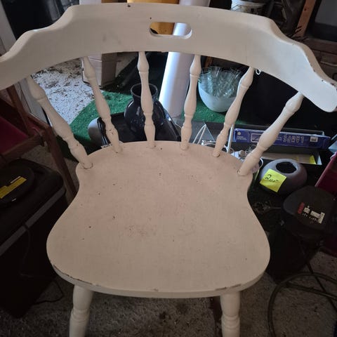 Pen, gammel spisestol i tre. God å sitte på, men trenger åpenbart overflatebehandling. Kan hentes ved Sagene skole.