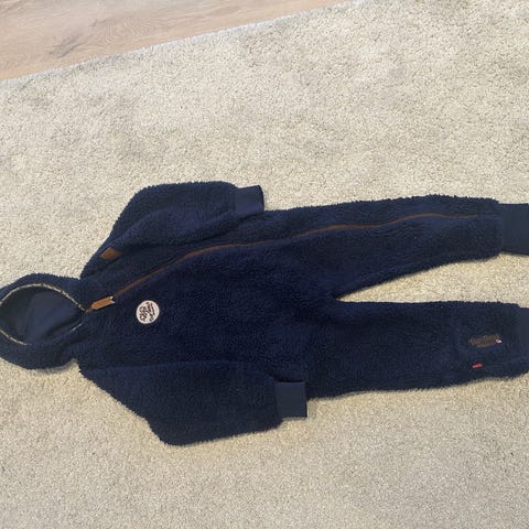 Super fin og god fleecedress. Veldig søt på. Ingen bruktmerker jeg kan se. Mørk blå med lys blå glidlås.