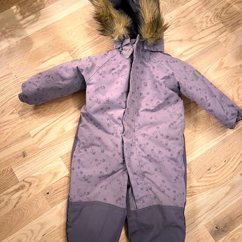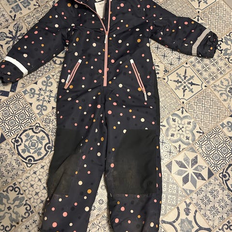 Vinterdress til gutt i størrelse110/ 116. Dressen er blå med mønster i kontrastfarger og har hette med avtakbar eller fast pelskant (basert på bildene). Den har lange ermer og ben, strikk ved håndledd og ankler, samt refleksdetaljer nederst på bena.
