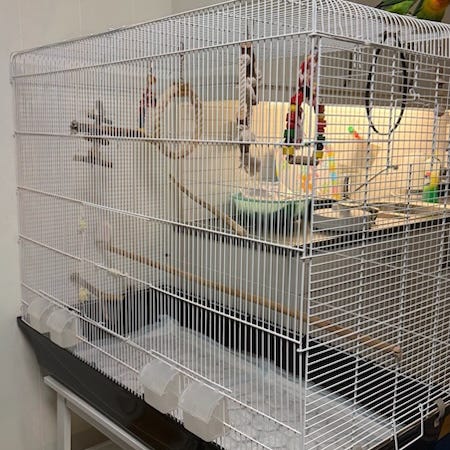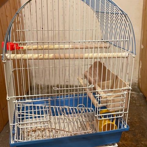 Fuglebur i metall med sort bunn og buet topp. Buret har flere sittepinner i tre og ulike leker/klatrestativer i tau og tre. Det følger også med fôr- og vannbeholdere som festes på innsiden av gitteret. Passer til mindre og mellomstore burfugler, med god høyde for klatring og aktivitet. Nederste del har uttakbar bunnskuff for enklere rengjøring.