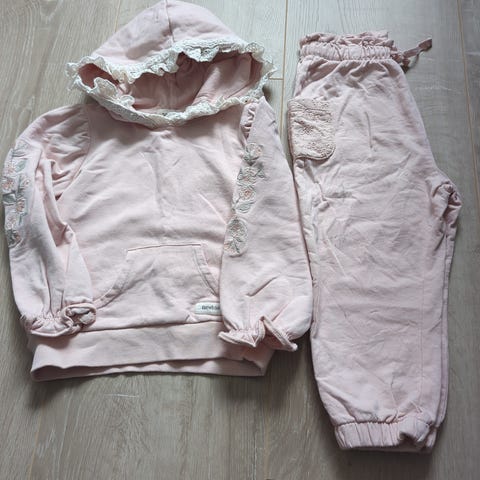 Klespakke til jente i størrelse 98/104 selges samlet for 500,- kroner. Klærne fremstår som pent brukt, uten hull men har noen anmerkninger i form av flekker. Se egne bilder for nærmere beskrivelse av anmerkninger.