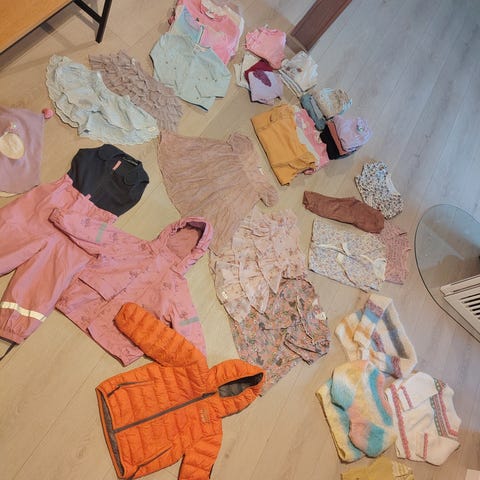 Nydelig pakke med rosa klær til en liten prinsesse 🩷 Alt i str 98-104. 19 plagg: cardigans, gensere, kjoler, skjørt, jumpsuits, pyjamas og bukser. Pent brukt og for det meste plettfritt selv om enkelte plagg kan ha noe smått etter bruk. Mange av plaggene er kun vasket og har ikke blitt brukt. Merker som Lil’ Atelier, Name it, Palomino, Lindex, Newbie, H&M og Cubus. Samlet 1350,-