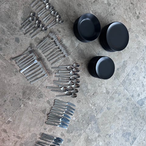 Settet inneholder: 4 store tallerkener, 3 små tallerkener, 4 boller og 1 stor stekepanne.