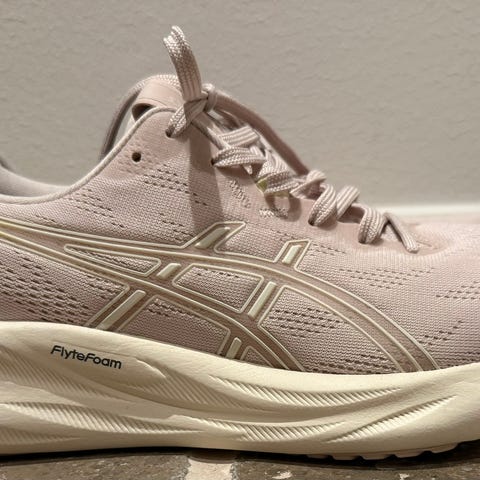 Asics Gel-Cumulus 27 GS løpesko i størrelse 37. Modellen har overdel i pustende mesh. Fargekombinasjon bluebell/dark olive, som fremstår som lys lilla med detaljer i en mørkere nyanse. Skoen har dempet mellomsåle og yttersåle i gummi tilpasset løping på hardt underlag. Egnet som løpesko og annen fysisk aktivitet.