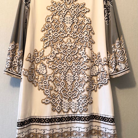 Hale Bob kjole i størrelse L for dame. Kjolen er flerfarget med et detaljert, grafisk og blomsterinspirert mønster i hovedsakelige toner av svart, grått, beige og hvitt. Rund hals med dekorative perler og applikasjoner langs halslinningen. Stoffet er lett og faller mykt, med et helprintet mønster både foran og bak. Passer som penkjole eller til hverdagsbruk avhengig av styling.