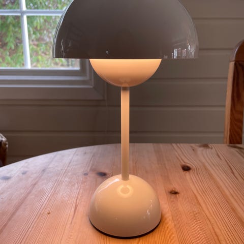 Stor Verner Pantone bordlampe. Lampen fra Louis Poulsen har et klassisk design med en hemisfærisk, hvit lampeskjerm i akryl, en hvit lampefot i plast. Lysbryter har to av og 3 på innstillinger. Lampefoten har gulnet over tid, men ellers pent brukt og i god stand. Diameter 50cm, og høyde 70cm. Hentes på Frogner/Oslo