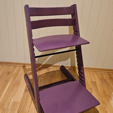 Stokke Tripp Trapp høy barnestol i grå farge. Klassisk trappeformet stol med justerbart sete og fotbrett som kan tilpasses barnets høyde. Stolen er laget i tre og er konstruert for å gi barnet en stabil og ergonomisk sittestilling ved bordet. Egnet fra småbarnsalder og oppover, avhengig av tilpasning av sete og fotbrett. Har også bøyle og ryggstø som kan festes på stol. Dette selges for 250,- ved kjøp av stol. Kan hentes på adr. Damlia, 7027 Trondheim.