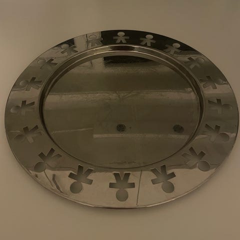 Alessi fat i metall med karakteristiske figurutskjæringer langs kanten. Rund form med speilblank overflate. Egner seg som serveringsfat eller dekorasjonsfat på bord eller benk.