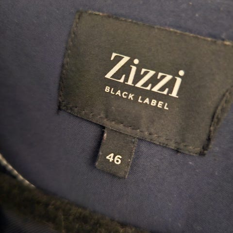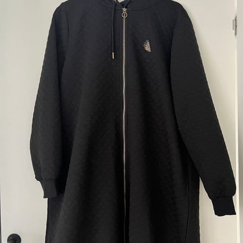 Zizzi jakke for dame i størrelse M=46/48 Jakken er grå/svart, laget hovedsakelig av viskose med noe nylon i blandingen, som gir et mykt og lett materiale. Modellen har lange ermer og åpen front uten lukking, liten splitt i sidene