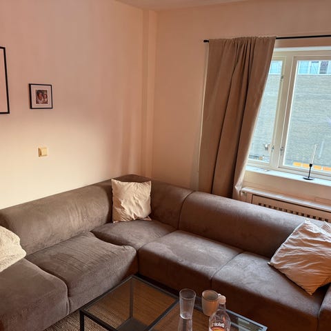 Må hentes i Oslo. Sofaen passer ikke i heisen og må bæres – anbefales å være to personer. Vi kan hjelpe til med bæring ned. Benene kan tas av for transport.