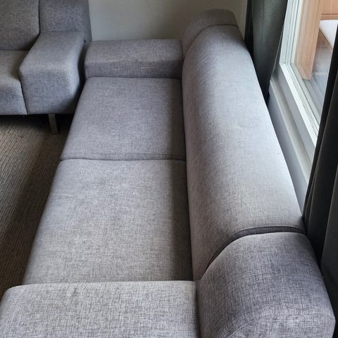 Nantes er et slitesterkt og robust stoff som fortsatt er i god stand. Putene har fortsatt godt spenn, og sofaen har ikke blitt myk eller sunket. Sofaen er godt brukt i en småbarnsfamilie og har normalt brukspreg. Den har ikke lukt, men vil ha nytte av en rens for å bli helt fresh igjen.