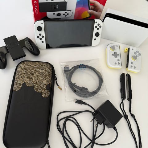 Nintendo Switch OLED spillkonsoll i hvit farge. Konsollen har OLED-skjerm og avtakbare Joy-Con-kontrollere. Bildene viser at det følger med dokkingstasjon, strømadapter, HDMI-kabel, håndleddsstropper, bæreveske og et spillkort som står i konsollen. Systemet kan brukes både håndholdt og tilkoblet TV via dokkingstasjonen. Egnet for én eller flere spillere, avhengig av spill og ekstra kontrollere.