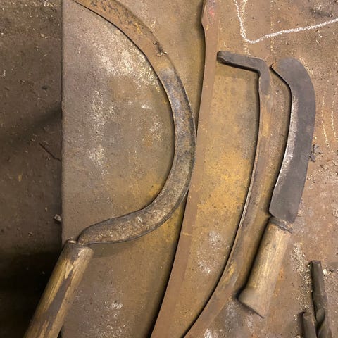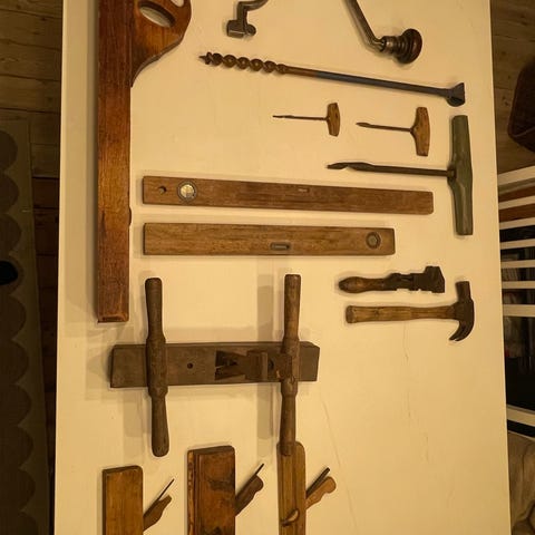 Diverse gamle håndverktøy i metall og tre. Pakken inneholder flere hammere i ulike størrelser, to borvind er/ hånddriller og to håndsager med håndtak. Verktøyene fremstår som eldre og godt brukte, egnet for den som trenger reservedeler, restaurering eller dekorative formål i verksted, garasje eller som interiørdetaljer med industrielt preg.