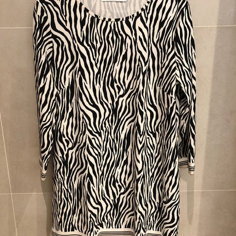 Ilse Jacobsen hverdagskjole i størrelse L. Kjolen har et flerfarget mønster i beige, brune og svarte toner. Modellen har lange ermer og rett fasong. Stoffet fremstår som mykt og elastisk, egnet til hverdagsbruk. Passer til dame.